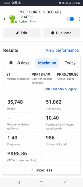 Spent PKR 5,709 → Generated 31 sales at just PKR 184.19 per purchase.