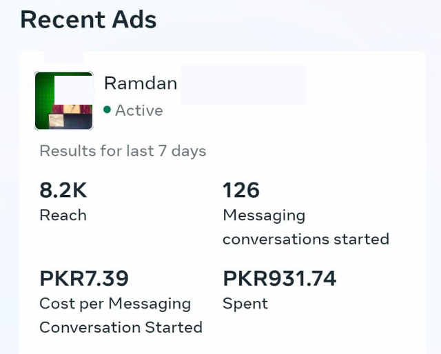 Ran a message-based campaign that generated 126 conversations at just PKR 7.39 per lead.